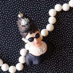 Are you a classic film lover?? Then we know you’ll love this ornament! It features Audrey Hepburn in her iconic black dress with matching black sunglasses and ornate necklace laying across her chest! Her hair is pinne4d up in her signature up-do and accented with a pearl tiara! Made by Cody Foster. Made of glass. Dimensions: 5.25″. Item #: GO-6732