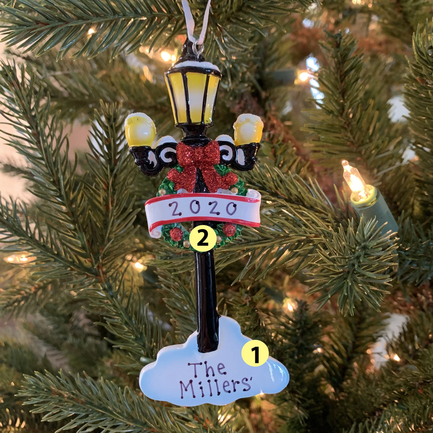 Have someone who is a light in your life?? This is such a cute ornament for them! It features a gorgeous black lamp post with bright yellow lights decorated with a wreath with a bright red glittered bow! Across the wreath sits a white banner for you to write a name on, and put the date at the bottom! Made of resin. Dimensions: 2″ x 4.75″. Item #: OR1862