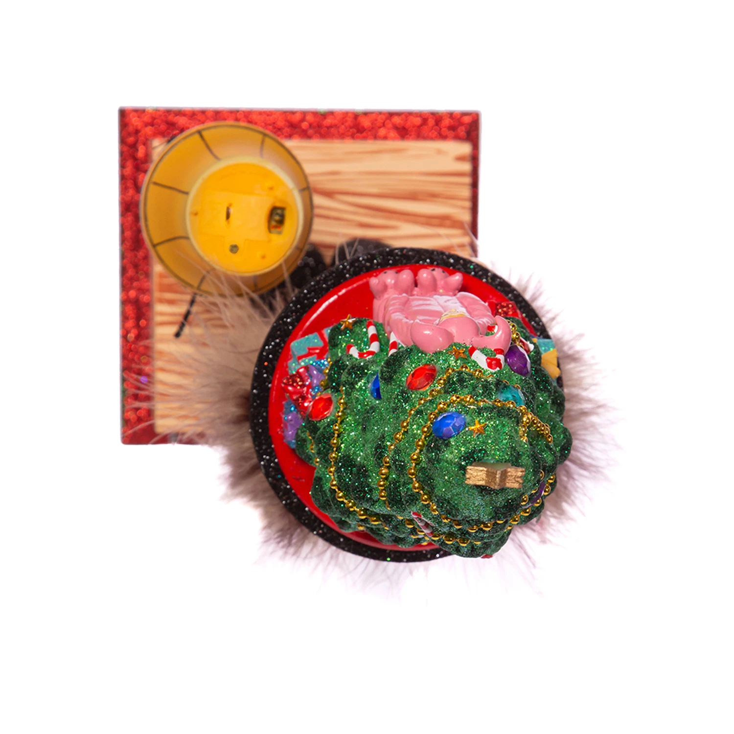 This nutcracker features a nutcracker dressed as Ralphie’s dad in a brown glittered suit perched on top of the famous FRAGILE box with his beloved leg lamp set up next to him! In top of his head sits a large, beautifully decorated Christmas tree surrounded by glittering presents and Ralphie in his bright pink bunny suit! Made by Kurt Adler. Made of wood. Dimensions: 15″ x 6.5″. Item #: CS6201LÂ