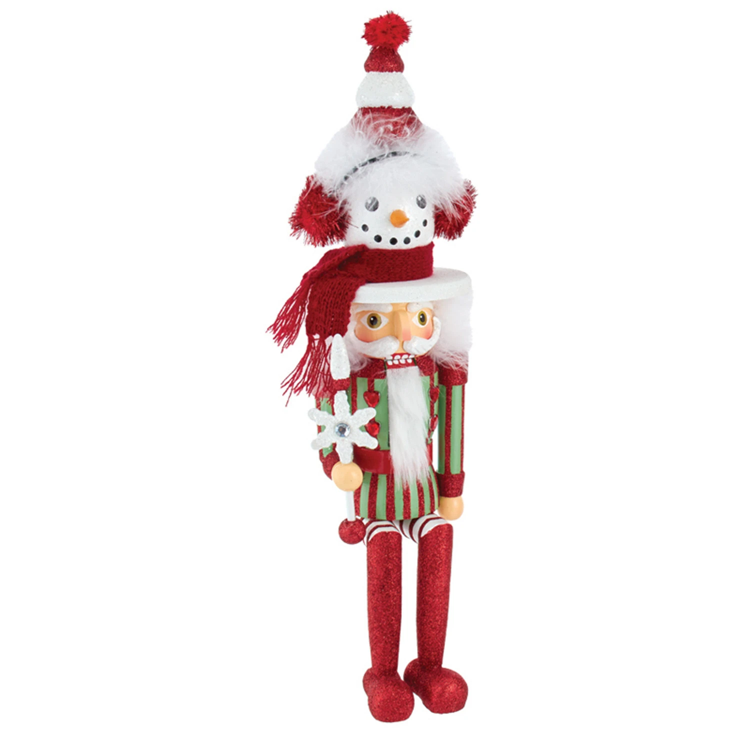 Adorn your shelf with these gorgeous little nutcrackers! Hollywood Nutcrackers are known for their flashy appearance! Each one of these are covered in bright red and green glitter and jewels! They have on striped pants and a flat bottom to sit snuggly on your mantle. Choose between a nutcracker topped with a snowman face wearing a cozy hat, a nutcracker topped with a green present with polka dots, or a nutcracker topped with a giant white glittered tree dotted with red stars! Each sold individually. Made by Kurt Adler. Made of wood. Dimensions: 17″ x 5″ x 5″. Item #: HA0541Â