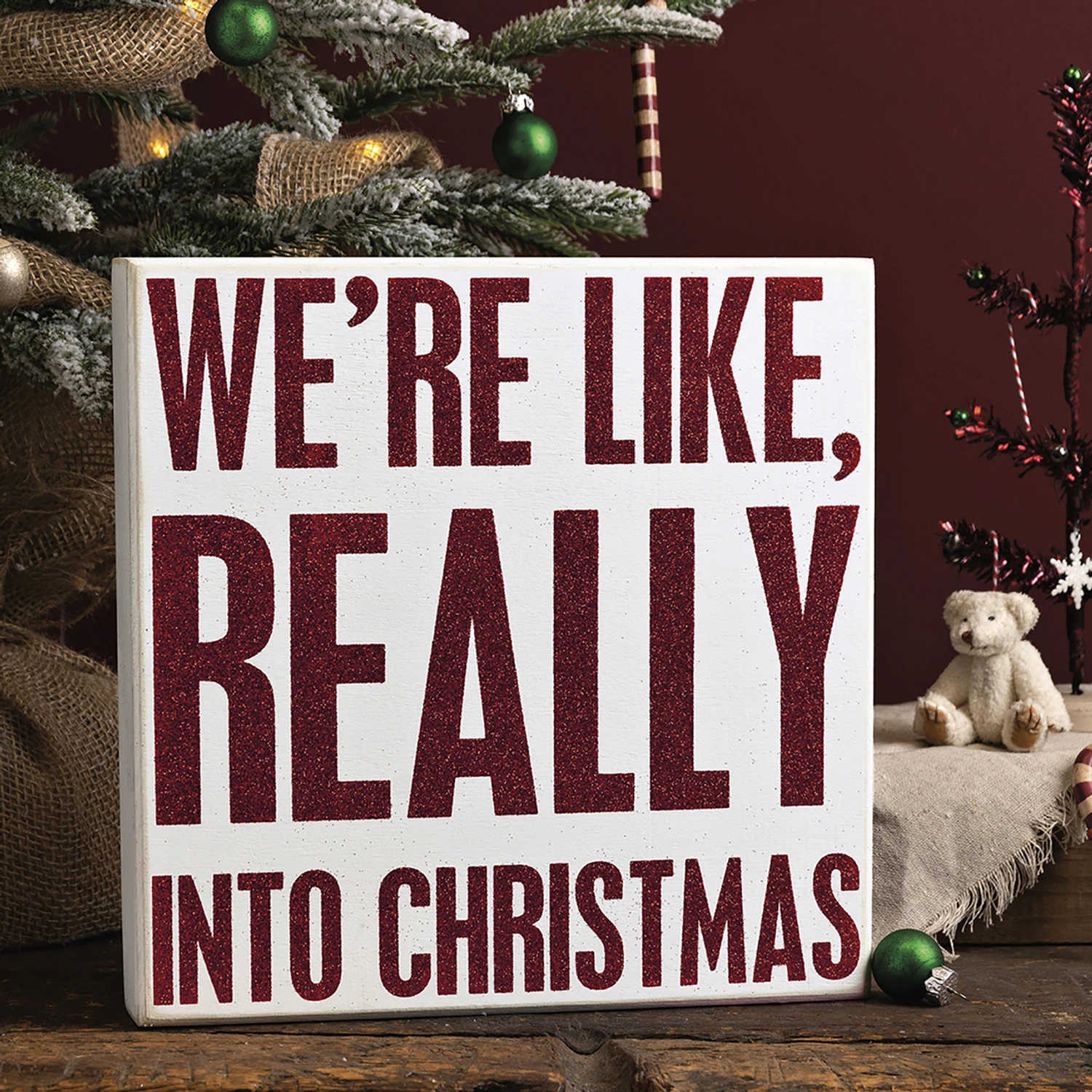 Ya know, we love Christmas. Like a lot. This sign is a funny sentiment that is sure to match any decor! It features a white block with red glitter writing! Made by Primitives By Kathy. Made of wood. Dimensions: 10″ x 10″ x 1.75″. Item #: 110139