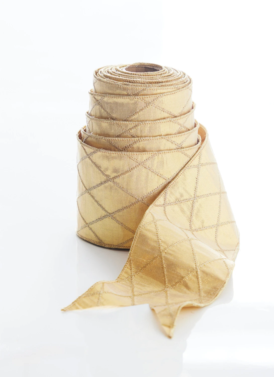 This ribbon is fit for a princess! If features metallic gold fabric with diamond shapes sewn into the fabric! Made by Raz Imports. Made of polyester. Dimensions: 4″ x 10 yards. Item #: R4371770