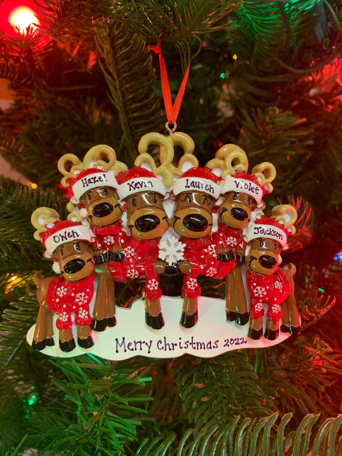 This sweet family is ready for the holiday! Each one has on a matching red sweater with snowflakes and red Santa hats! Get each family member’s name written on the hats and the year at the bottom! Made of resin. Item #: OR2256-6